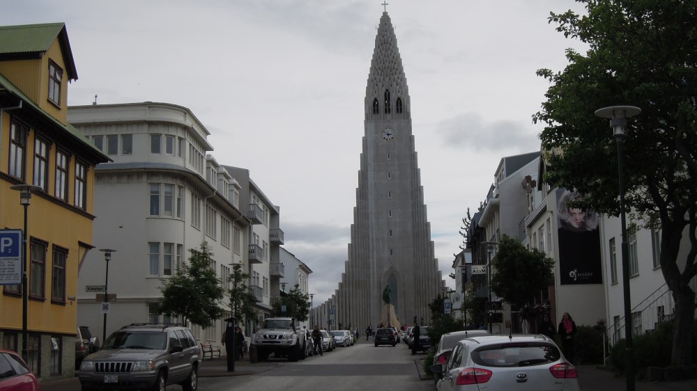 mit Blick auf das Wahrzeichen von Reykjavik. Weithin erkennt man den 76 m hohen